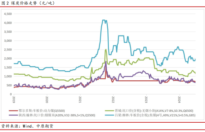 2019年以来,煤价走势主要包括三个阶段:一是2019年至2020年一季度,由于经济增速放缓,需求下降,煤价处于下行趋势;二是2020年二季度至2021年四季度,受新冠疫情、政策因素影响,煤价迎来一轮牛市上涨;三是2021年四季度至今,随着供需矛盾缓解,煤价从高位回落,并回归至历史合理区间。从图2可以看出,选取的四个煤炭现货价格指标中期走势基本一致。通过相关性分析显示,2019年以来,焦煤现货与动力煤现货价格相关性系数为0.81,焦煤现货与无烟煤现货价格相关性系数为0.80,焦煤现货与烟煤现货价格相关性系数为0.86,均处于较高水平。由于上述现货报价均为周度价格,频率较慢,如果使用期货价格监控更为方便。目前仅有上市的焦煤期货交易活跃,考虑选定焦煤期货作为日常监控煤炭市场价格变化的指标。通过对焦煤期货价格和现货价格的相关性分析得出,自2019年以来,焦煤期货价格和现货价格之间的相关性系数为0.82,也处于较高水平。因此,可以通过关注焦煤期货的日常波动来判断焦煤现货现货价格的趋势,并进一步为判断整个煤炭现货市场(如动力煤现货、无烟煤现货、烟煤现货)的运行趋势提供参考。
