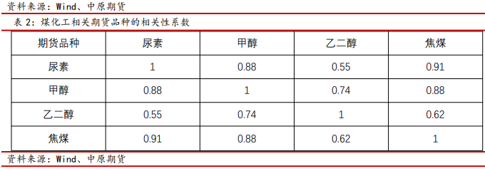 从政策角度来看,煤炭作为我国基础能源,价格走势稳定是重中之重。一旦其价格发生巨大波动,反映出市场政策或者经济需求也发生了重要变化。由于期货价格具有高度的金融属性,其对经济政策和宏观形势的反应也较为敏感,并先于现货市场表现。因此,当煤炭价格出现大幅上涨或者下跌时,就容易成为主导煤化工期货品种价格走势的重要因素。从另外一个角度来看,尿素、甲醇、乙二醇三者之间的期货价格走势也具有较高的相关性,反映出煤化工品种会受共同的煤炭成本因素影响,而出现共振。