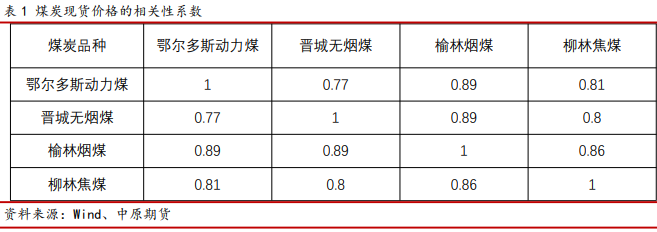 通过前文分析看出,煤化工品种的原料煤种类较多,主要包括动力煤、无烟煤、烟煤等。因此,现货价格方面选择具有代表性的秦皇岛港动力煤(Q5500)、晋城无烟煤、榆林烟煤和柳林焦煤作为分析指标。之所以增加焦煤,主要是目前期货市场上只有动力煤期货和焦煤期货,且较为活跃的只有焦煤期货,因此选取焦煤作为期货和现货的中间桥梁,来进一步分析原料煤和煤化工品种的相关性。