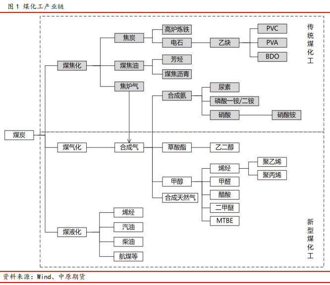 我国能源资源特点为“富煤、贫油、少气”,因此煤炭是我国最主要的能源。从我国煤炭消费结构来看,电力、钢铁、建材、化工四大行业煤炭消费量占总消费比重超过90%,对应的可以将煤炭分为动力煤、炼焦煤、化工煤及其他。其中动力煤主要依靠煤炭燃烧产生的热值发电、发热,煤炭发热量,煤种包括褐煤、无烟煤、长焰煤、不粘煤和贫煤;炼焦煤主要用于冶金、炼焦,包括气煤、肥煤、气肥煤、1/3焦煤、焦煤和瘦煤;化工煤主要用于生产能源化工产品,包括褐煤、无烟煤及部分烟煤等。化工煤经化学加工转化为气体、液体和固体燃料以及化学品的过程称为煤化工。煤化工涉及的相关期货品种较多,其中尿素、甲醇、乙二醇等品种均属于煤气化产业链,具有较强的相关性,本文将进行重点探讨。