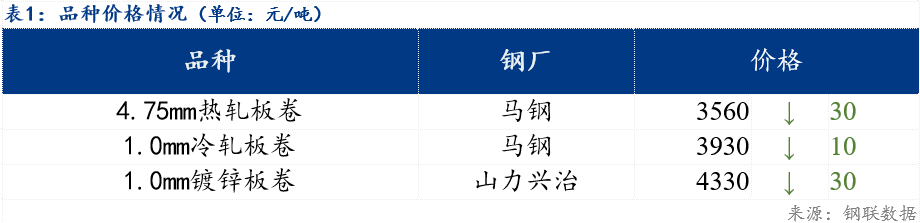 合肥冷轧及镀锌板卷价格震荡下行。价格方面:冷轧板卷价格下跌10元/吨,1.0mm马钢价格3930元/吨;镀锌板卷价格下跌30元/吨,1.0mm山力兴治价格4330元/吨。市场方面,今日热卷期货盘面震荡下行,市场信心受挫,现货价格持续下跌,市场成交偏差。心态方面,受热卷期货盘面震荡走弱影响,加之成交表现较差,商家对后市行情多持悲观心态为主。