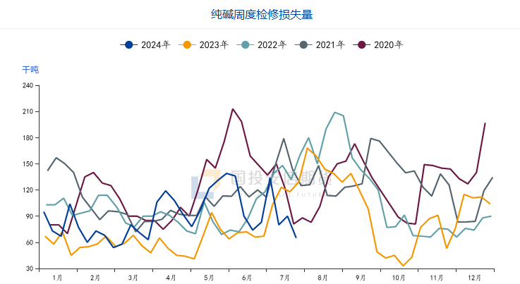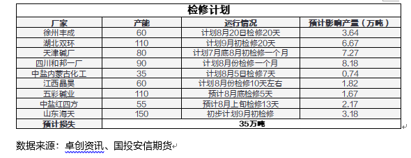检修量同比往年明显减少,供给高压运行,而需求呈现走弱态势,下游利润压缩,光伏冷修增加,轻碱需求延续低迷态势,下游采购意愿低,驱动弱势继续,期价或继续下移考验氨碱成本支撑。进入8月份,检修量增加,供给或相对7月出现一定缓解,但若无突发事件,缓解力度有限,供给还是处于一个历史的偏高水平运行。