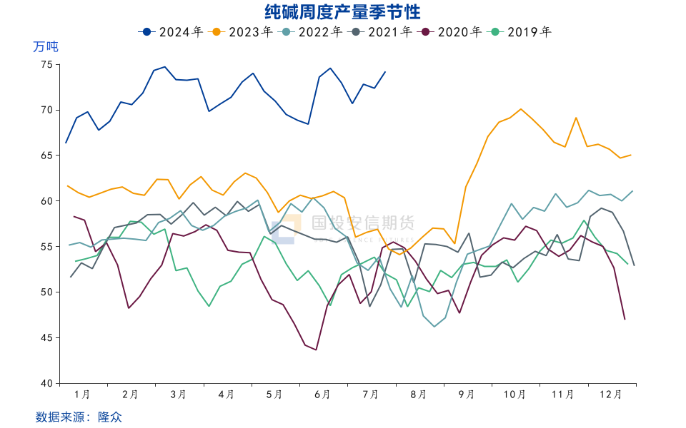 今年检修旺季,纯碱检修量同比往年明显减少,周度产量基本维持在70万吨以上高压运行,行业呈现累库格局,期现持续下跌。