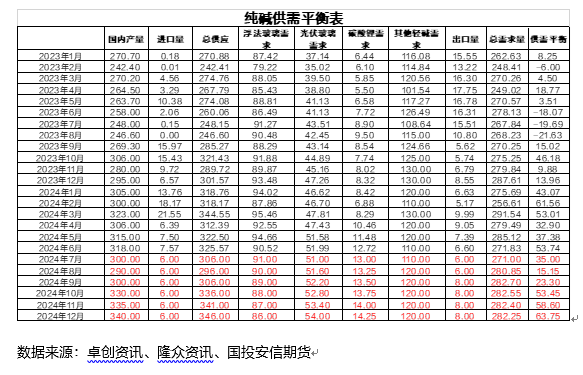 浮法玻璃后期给的逐步收缩产能预估。光伏增速今年增速放缓,根据光伏新增装机预估增速是11.3%,根据投产进度预估增速是43.89%,中和下来我们给出的增速是20%左右。碳酸锂今年对纯碱需求或达到140万吨。进出口方面,下半年或再度转为出口为主的模式。轻碱的需求我们维持平稳假设。供应端,由于今年夏季检修低于市场预期,供给预期在7-8月份相对之前有一定提高,后期考虑新投入的产能,2024年整体是供需宽松格局。因为当中未考虑中下游的库存和补库情绪,如果出现下游补库或者交割库补货或出库情况,对供需平衡表会出现一定影响。