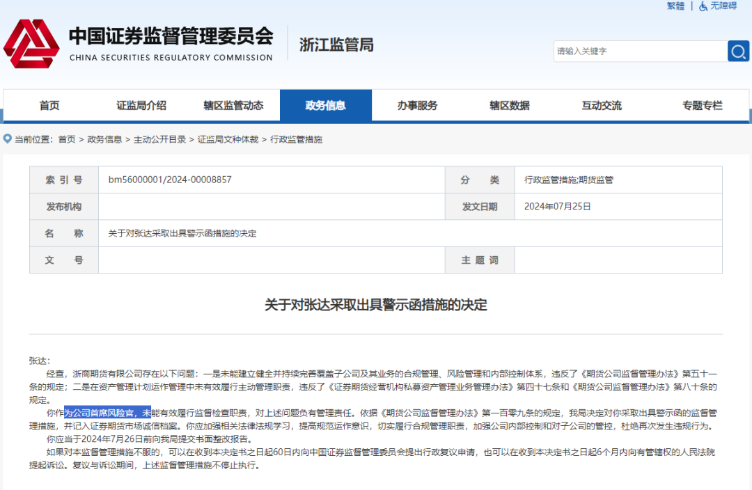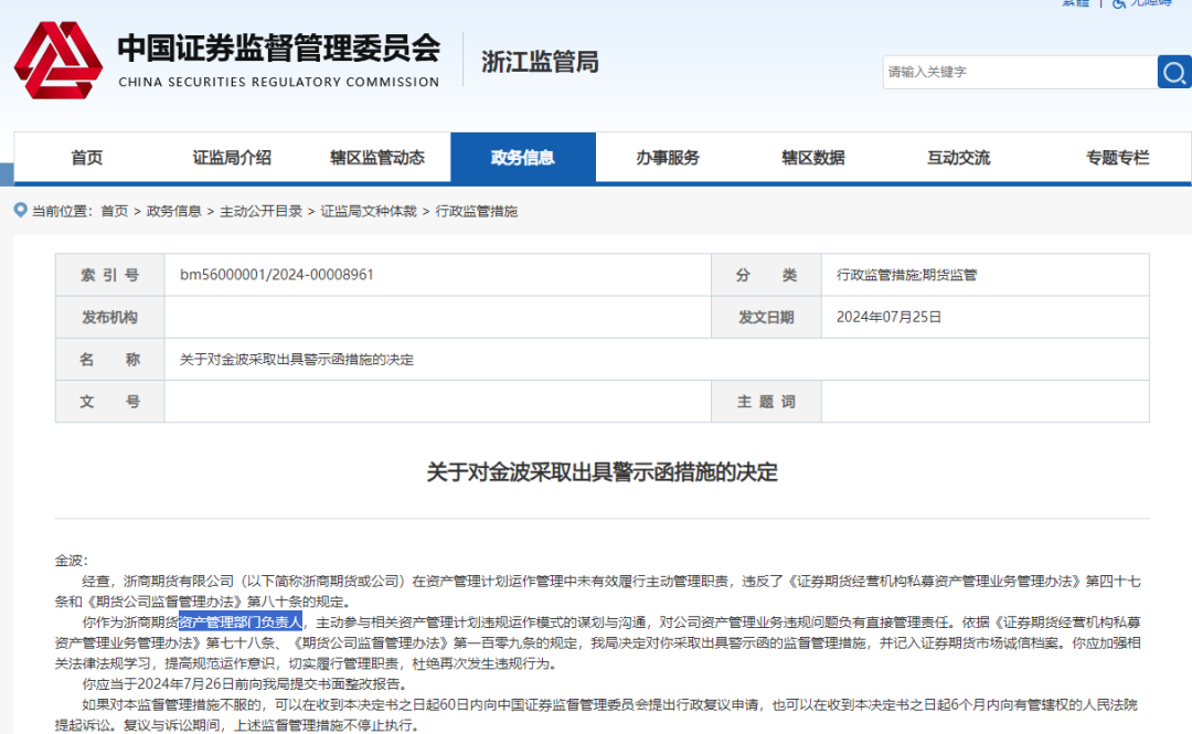 针对违规事项,涉事机构领罚,相关责任人也难辞其咎。例如,7月25日,浙商期货由于未能建立健全并持续完善覆盖子公司及其业务的合规管理、风险管理和内部控制体系,同时在资产管理计划运作管理过程中未有效履行主动管理职责,被浙江证监局采取责令改正的监理措施。浙商期货首席风险官张达、资产管理部门负责人金波等相关负责人均被出具警示函。