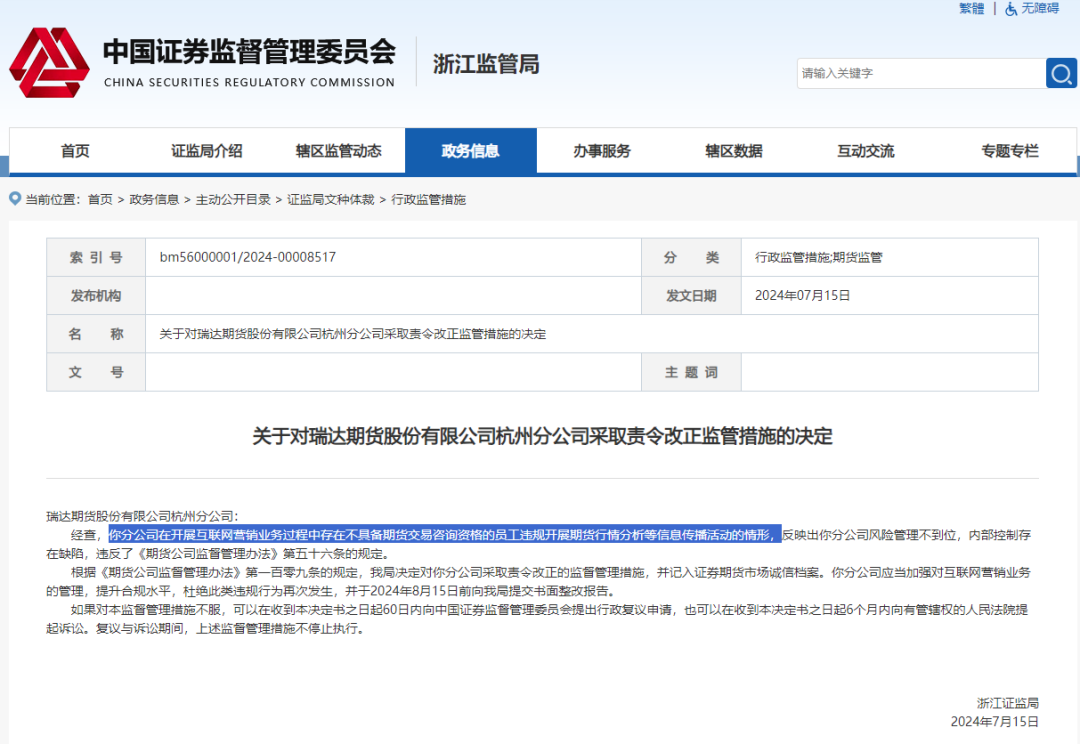 7月15日,浙江证监局公告称,瑞达期货杭州分公司在开展互联网营销业务过程中存在不具备期货交易咨询资格的员工违规开展期货行情分析等信息传播活动的情形,要求其加强相关法律法规学习,提高规范运作意识,恪守从业准则,避免再次出现违规行为。