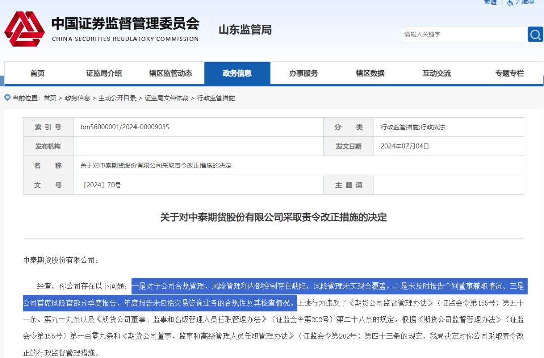 当下,期货公司因多项违规集中受罚已成为常态。7月4日,山东证监局向中泰期货开出罚单,原因是其存在以下问题:一是对子公司合规管理、风险管理和内部控制存在缺陷,风险管理未实现全覆盖;二是未及时报告个别董事兼职情况;三是公司首席风险官部分季度报告、年度报告未包括交易咨询业务的合规性及其检查情况。