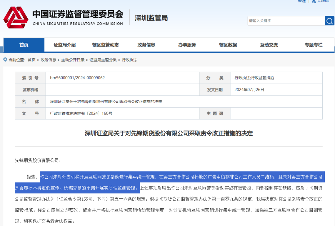 7月26日,先锋期货因未对分支机构开展互联网营销活动进行集中统一管理,在第三方合作公司投放的广告中留存非公司工作人员二维码,且未对第三方合作公司是否履行不得虚假宣传、诱骗交易的承诺开展实质性监测管理,被深圳证监局采取责令改正的监管措施。