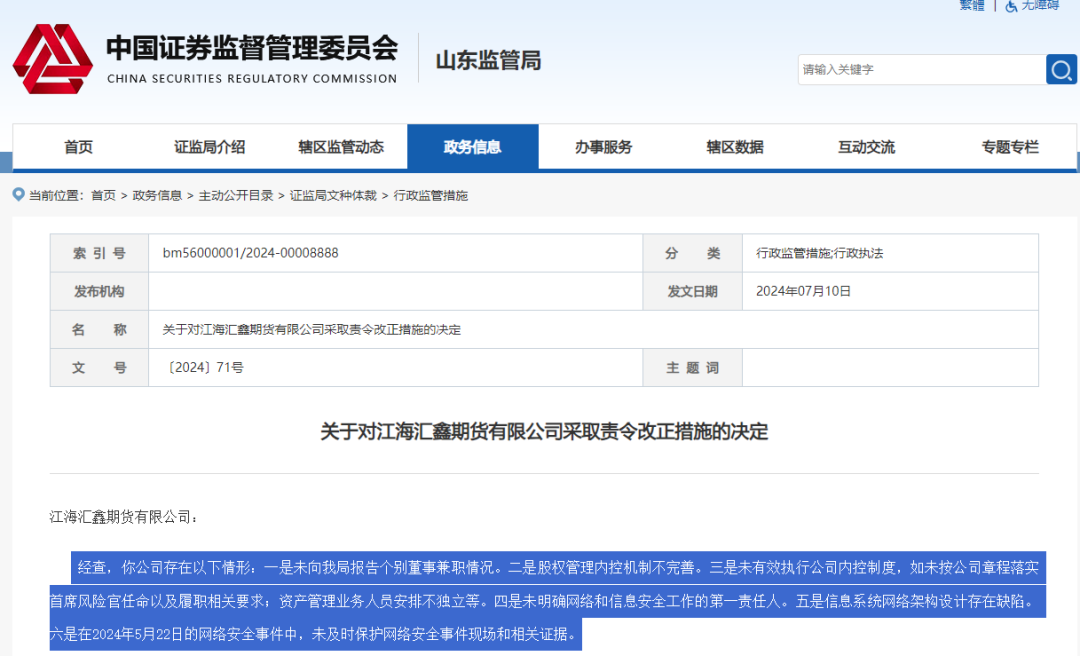 还有江海汇鑫期货,因未向监管部门报告个别董事兼职情况、股权管理内控机制不完善、未有效执行公司内控制度、未明确网络和信息安全工作的第一责任人、信息系统网络架构设计存在缺陷等原因,被山东证监局采取责令改正措施。