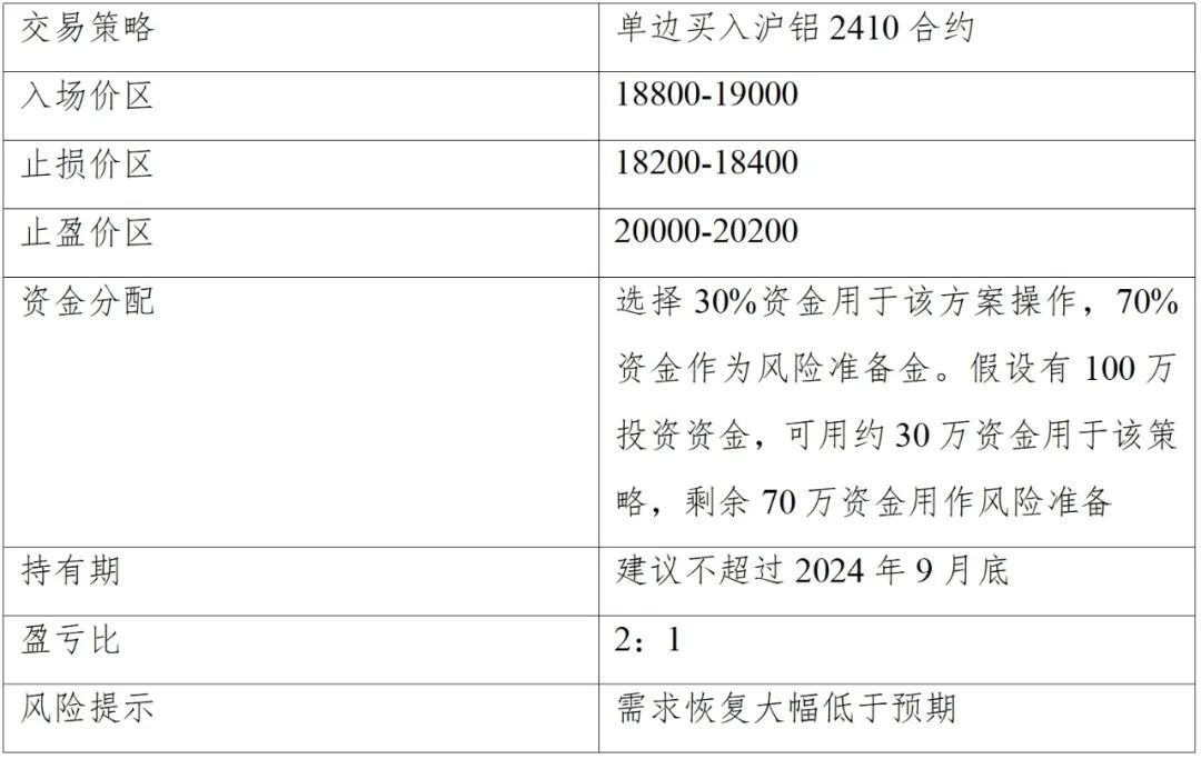 中长期而言,铝土矿端供应的不确定性、电解铝供应产能天花板限制、电解铝铝水比例逐步提升等因素影响使得铝价重心上移,市场对新能源市场铝用消费仍有乐观预期。短期价格在宏观利空压制下出现大幅下跌,待情绪充分释放,伴随基本面边际好转,比如金九银十旺季需求,及云南丰水期结束后供应端可能发生的扰动等均将给铝价带来反弹的驱动。维持低买思路,择机选择AL2410合约买入,入场价位参考18800-19000元/吨。