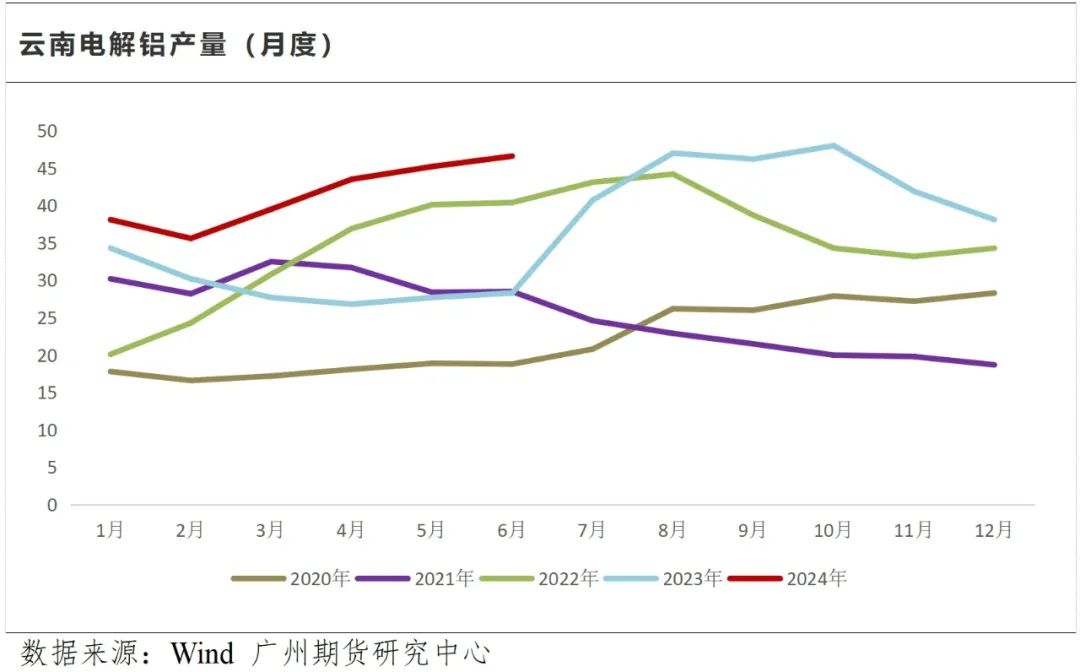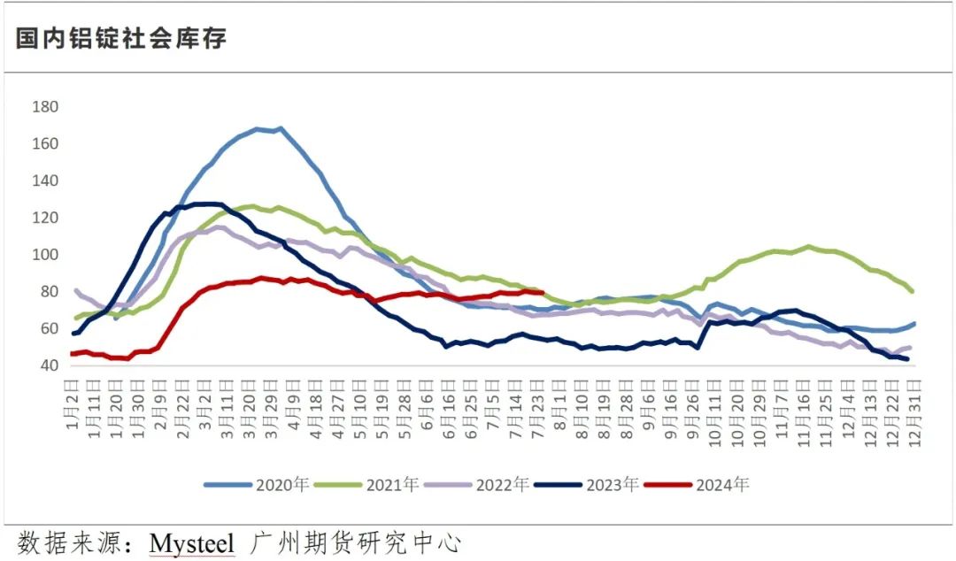今年5月国务院发布《2024-2025年节能降碳行动方案》,7月国家发展改革委、工业和信息化部、生态环境部、市场监管总局、国家能源局联合印发《电解铝行业节能降碳专项行动计划》,提及到2025年底,电解铝行业能效标杆水平以上产能占比达到30%,能效基准水平以下产能完成技术改造或淘汰退出,行业可再生能源利用比例达到25%以上,助力铝水直接合金化率提升至逾90%。据Mysteel调研,6月国内电解铝铝水比例为72.7%,进入7月,因供增需弱,铝锭社会库存缓慢回升,而往年同期呈现去化态势,对价格形成一定利空驱动。但随着后期铝水比例的进一步抬升,预计铝锭供应难以给价格带来持续性压力。