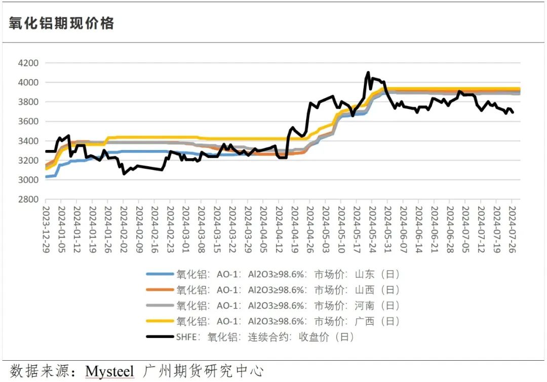 近期氧化铝期货价格继续震荡下行至3550元/吨附近,但现货价格依旧不跌,期现基差继续走扩,部分贸易商通过盘面低价接仓单降低采购成本,以缓解氧化铝厂长单交付压力,导致现货依旧缺乏流通性。展望后市,氧化铝需求在三季度或相对偏稳,四季度随着西南枯水期到来或存减量风险,供应端或仍受矿端制约,尤其四季度国产矿山开采政策持续收紧的影响。