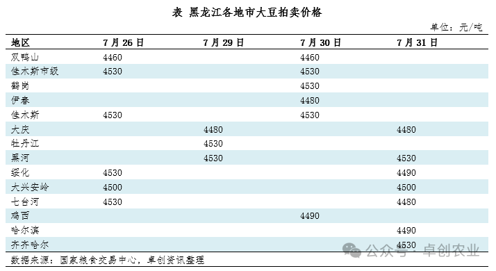 东北产区余粮非常有限,农户基本无余粮,贸易商手中还有少量库存,主要依靠陈粮供应。因九三集团、黑龙江及中储粮公司投放大豆,供应量较月初有所增加。截至7月30日,预计东北地区本年度大豆余粮水平为9%,低于上年度同期2个百分点。九三集团公开投放22130吨、黑龙江省储公开投放超60万吨,因价格偏高,成交较少。近两周大部分地市拍卖价格基本平稳,个别地市起拍价格较上周下调40-50元/吨。