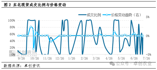 与供应量相比,7月国内大豆需求量基本处于全年低点,成交量不及上月。7月中旬以来,现货市场成交率整体下行,低于前期。由于机构投放数量较多,现货市场采购意愿下降,市场活跃度降低。截至7月26日当周,7月月均成交率为32%,较6月下降16个百分点。随着供应投放持续,湖北新豆陆续上市,下游在气温下降后采购需求或有提升,预计8月市场成交率或先低后高,逐步提升。