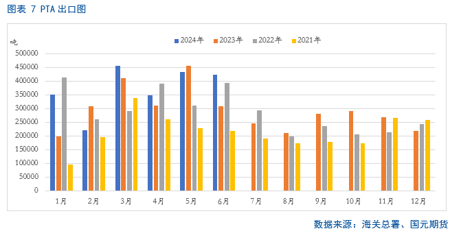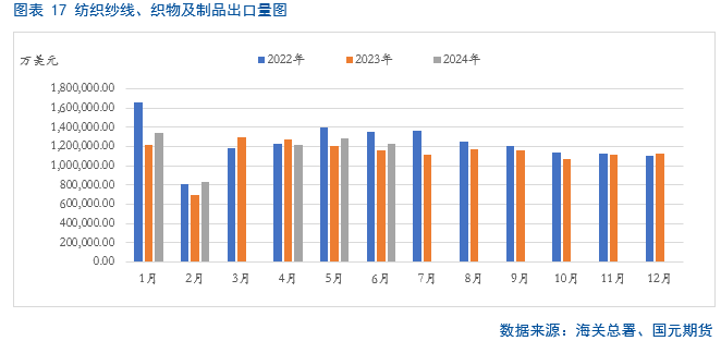 7月份下游聚酯各品种及终端制造业装置开工率呈现小幅下滑,使得聚酯企业缩减了上游PTA原料的采购。不过由于聚酯产业链的利润由上游向中游和下游转移,导致多数聚酯品种利润呈现了明显的修复,因此加大了原料端PTA的库存。临近8月份,市场已逐步从传统的消费淡季向旺季转变,从下游各品种的库存来看,目前涤纶长丝各品种库存均呈现不同程度的去库,而涤纶短纤和聚酯切片库存略有反弹。从出口市场来看,据海关统计,2024年6月我国纺织纱线、织物及其制品出口金额为1224876.4万美元,虽然环比下滑,但同比增长6.7%;服装及衣着附件出口金额为1514641.3万美元,同比下降0.6%,呈现出此消彼长现象。