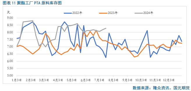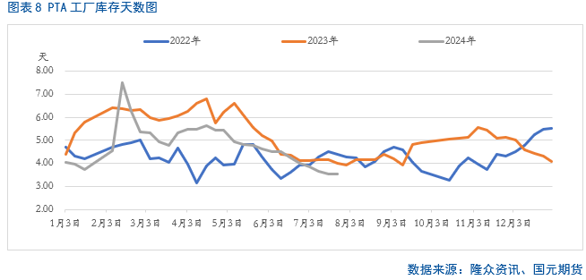 后期来看,8月份,市场已逐步从传统的消费淡季向旺季转变,聚酯及终端市场装置开工率或将存在上涨的预期,在前期涤纶长丝持续去库的背景下,或对上游PTA市场存在一定的正反馈。
