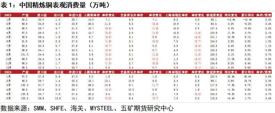 2024上半年,伴随铜价大幅变化,中国精炼铜需求也出现较大波动。1月份,在需求惯性和低基数效应下,精炼铜需求大幅增长,随着铜价从3月份开始攀升,国内精炼铜表观需求明显走弱,3-6月表观消费量均低于去年同期水平。上半年国内精炼铜表观消费量仅小幅增长1.7%。