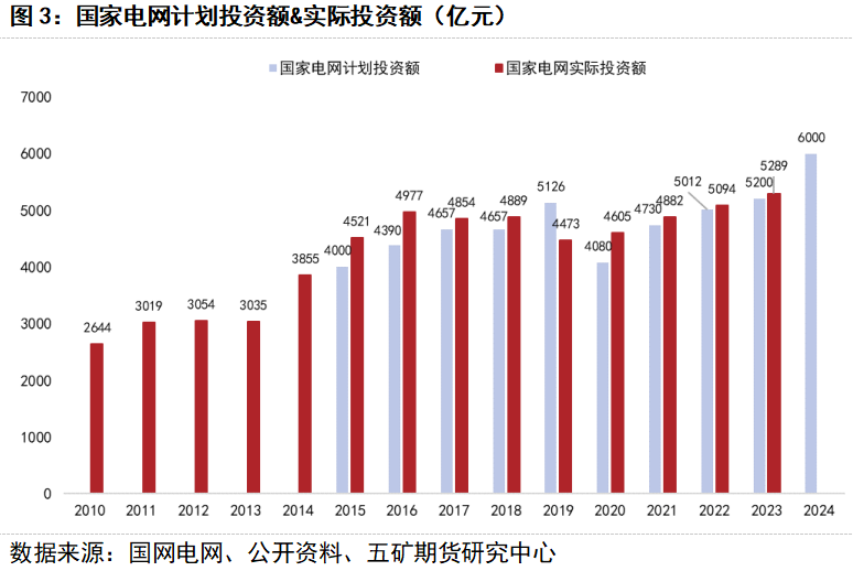 全年来看,由于消纳问题待解决,电源投资增速预计延续放缓势头。电网投资方面,为加快构建新型电力系统,国家电网公司2024年全年电网投资计划首次超过6000亿元,比2023年新增超过711亿元(增速超13.4%),新增投资主要用于特高压工程、电网数字化和智能化升级。电网投资增长将为铜需求带来较强支撑。