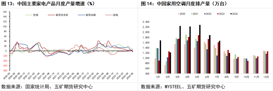 家电方面,2024上半年国内空调、洗衣机、冰箱、彩电产量分别为15705.6万台、5311.6万台、5051.0万台和9602.8万台,分别同比增长13.8%、6.8%、9.7%和0.4%,虽然国内地产数据偏弱,但低基数效应、以旧换新政策和海外需求高增长带动国内家电产品产量较快增长,其中1-4月增速较高。下半年以来,由于国内需求走弱和库存压力加大,国内以空调为主的家电产品排产数据走弱,海外排产增速高位回落,造成总排产增速预期下调。此外,随着上半年铜价走高,铜在家电产品中的应用出现部分替代,也在一定程度上影响了铜的需求量。