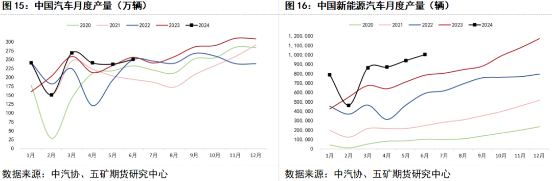 2024上半年我国汽车总产量约1388.8万辆,同比增长约4.9%,汽车总销量约1404.7万吨,同比增长约6.1%,产销增速呈现逐月下滑的态势。其中,上半年新能源汽车总产量约492.7万辆,同比增长30.1%,总销量约494.4万辆,同比增长约32.0%,总体新能源汽车产销增速偏高,且在降价、国内汽车消费政策和出口强劲增长支持下表现强于预期。下半年在以旧换新、部分城市放宽汽车购买限制等因素支持下,我国新能源汽车产销有望保持接近30%的增长速度,但海外贸易保护政策预计给出口带来一定的抑制。