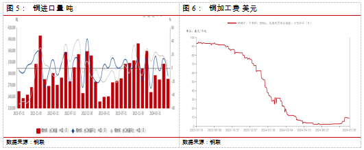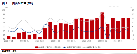 按照SMM调研数据,2024年6月中国精炼铜产量100.5万吨,同比增加9.5%,环比小幅下滑,预计7月产量环比增加1.2%。按照国统局数据,2024年6月国内精炼铜产量112.8万吨,同比增长3.6%,1-6月累计产量667.2万吨,同比增长7.0%。