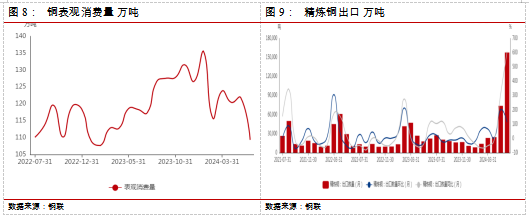 据mysteel数据,铜表观消费量连续八期出现下滑,2024年初进入传统淡季,预期铜消费整体延续下滑趋势。