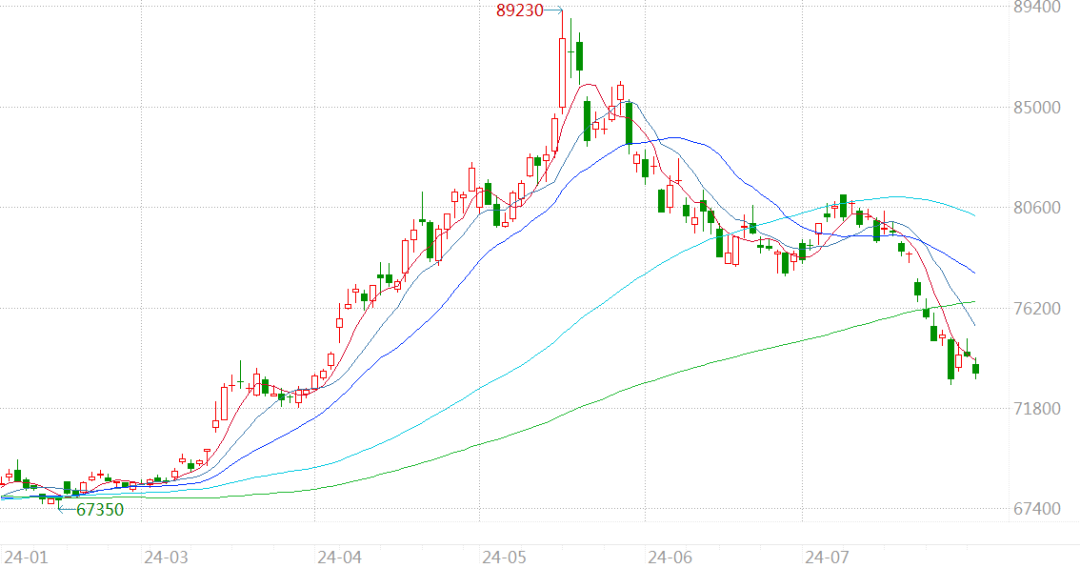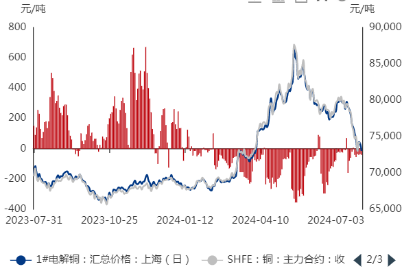 2024年7月22日-7月29日,铜2409合约震荡偏弱运行,开盘76120元/吨,最高至76610元/吨,最低72800元/吨,收至74040元/吨,较前一周跌2.3%。
