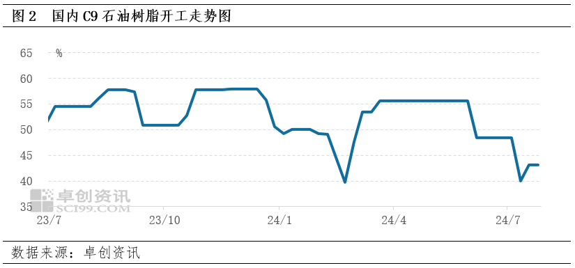 虽月中上旬濮阳新天装置重启,但由于高温天气等原因盘锦凯恒、抚顺裕龙、洲际汇鑫等多家装置停工,加之抚顺科隆阶段性检修,C9石油树脂市场整体开工负荷较6月有所下降,利多C9石油树脂市场。据卓创资讯统计,7月份C9石油树脂市场整体开工负荷下降至45%附近,较6月份下降7个百分点左右。