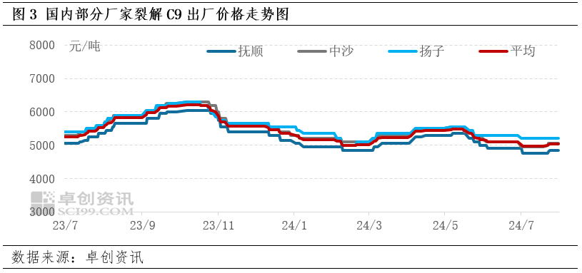 2024年7月份国内裂解C9均价下滑,7月份均价4989元/吨,环比下滑2.21%,同比下滑6.69%。原油价格震荡下行,成本面导向偏空。虽月内辽宁华锦及山东东明装置检修,但独山子石化装置重启,加之部分装置负荷有所提升,本月开工负荷较上月有所上升,主力下游芳烃月内厂家装置平稳运行,不过自上月中旬部分厂家装置停工检修持续,因此本月来看全国C9加氢装置开工负荷下滑,加之主力下游芳烃均价下跌,多重利空因素叠加情况下,7月份裂解C9均价有所下滑。