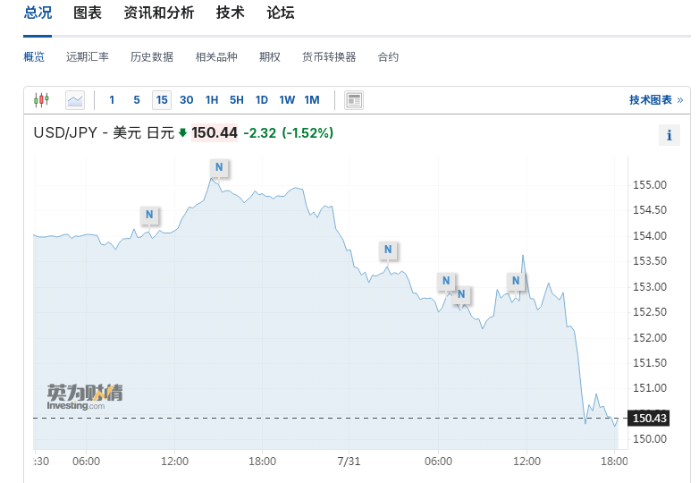7月31日,日本央行在货币政策会议上演“双重暴击”,不仅继3月决定解除负利率政策之后再次加息,还同时宣布了“缩表”计划。截至发稿,美元对日元汇率约为1美元兑150.44日元,跌幅扩大至1.52%。东证指数收涨1.45%,日经225指数收涨1.49%。