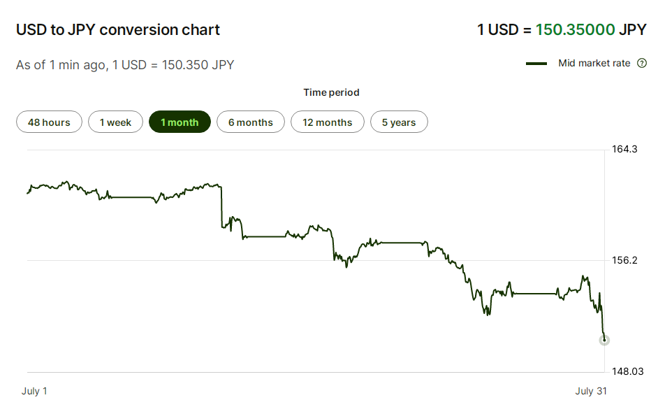 在日本央行宣布将利率上调至0.25%后,市场迎来了较为显著的变化。截至发稿,美元对日元汇率约为1美元兑150.44日元,跌幅扩大至1.52%。而在本月初,1美元还能兑换161。