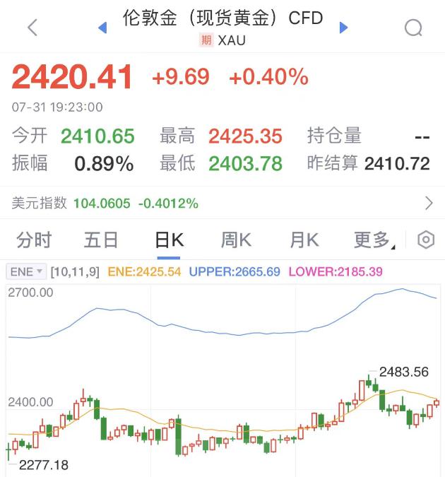 招金精炼交易部经理高伟指出,近期国际金价上涨一是受到冲高回落后的逢低买盘影响,二是中东局势紧张,地缘政治升级推动国际金价上涨。哈马斯领导人遭袭身亡,地缘冲突有继续升级风险。此外,虽然市场预期美联储维持利率不变,但是如果新闻发布会上鲍威尔发出降息信号,则将为9月降息开辟通道,或对金价形成更多利好。