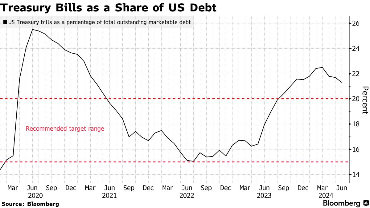 自去年年初以来,美国票据供应量增加了大约2.2万亿美元。这使得他们的债务总额超过了TBAC在周三的新指导之前建议的15%-20%的范围。
