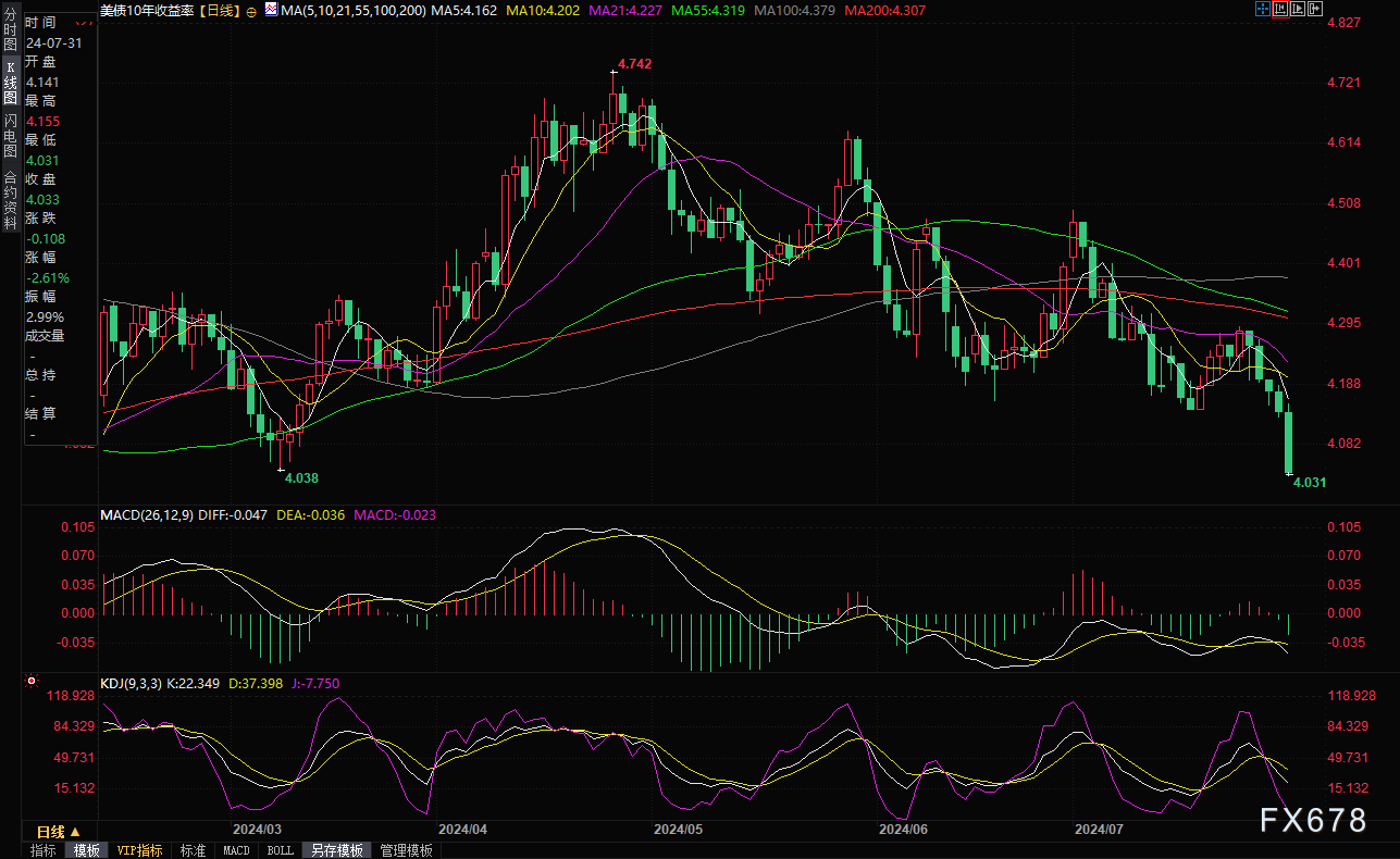周三美元指数大跌0.4%,收报104.05,盘中最低触及103.92,为7月18日以来新低。美国10年期国债收益率大跌2.61%,为连续五个交易日下跌,盘中最低触及4.031%,为3月8日以来新低,收报1.033%。