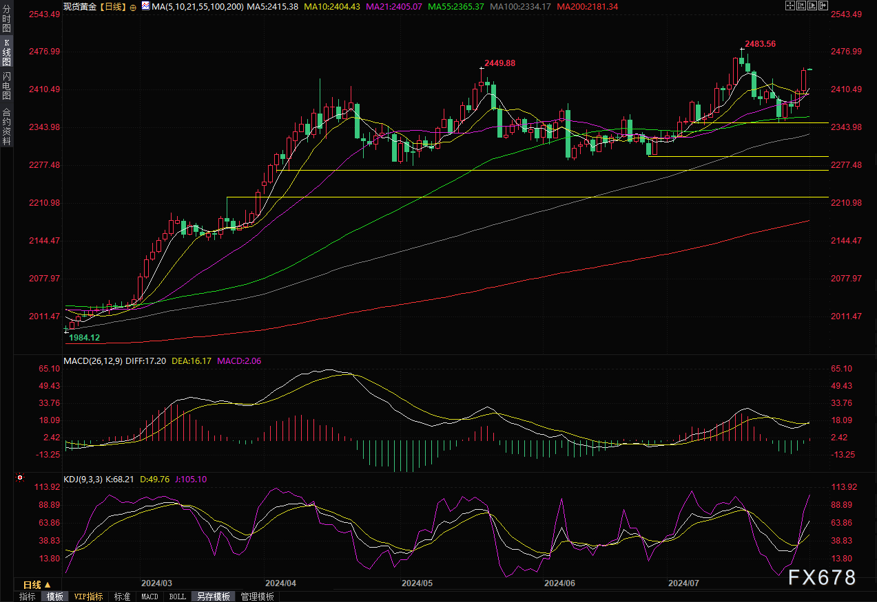 技术面来看,在跌破7月24日高点2431.87前,金价短线偏向继续震荡上行,有望再度试探历史高点2483附近阻力。