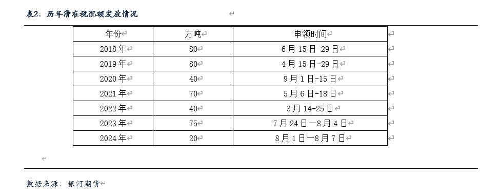 今日,根据国家发改委消息,2024年棉花进口滑准税配额总量为20万吨,全部为非国营贸易配额,限定用于加工贸易方式进口。申请时限:2024年8月1日-8月7日。关于配额轮出的消息在前几周开始在市场上有所流传,传言今年配额发放量大概在40-80万吨左右,但最新配额信息公布后今年配额发放量不及预期,本次的配额发放预计对郑棉影响不大,下面我们就今年的配额政策具体的内容是什么,今年的政策和往年相比有什么不同,以及配额对市场的影响如何进行分析。