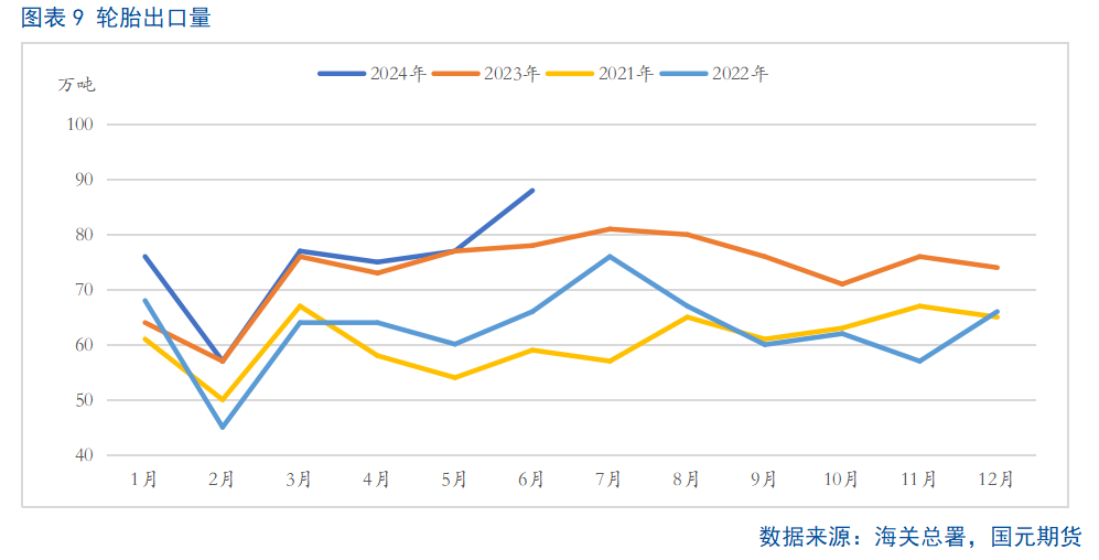 从出口市场来看,上半年国内轮胎出口市场依旧延续向好局面,据中国海关总署7月18日公布的数据显示,2024年上半年中国橡胶轮胎出口量达451万吨,同比增长5.3%。而6月当月的出口量达到88万吨,较去年同期上涨8.6%,较5月份上涨14.29%。因此在高出口以及相对高位的开工背景下,6月份我国橡胶轮胎外胎产量为9340万条,同比增加8.8%。
