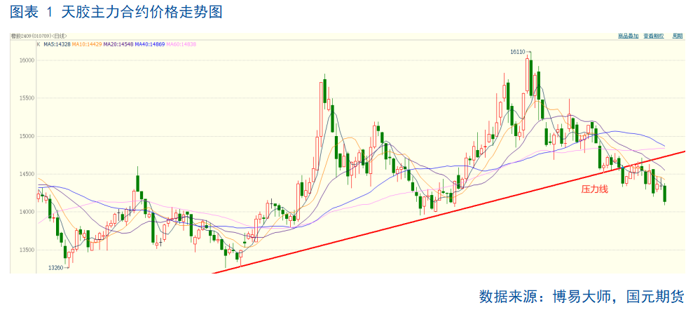 7月份,国内天胶主力合约价格走出了一波流畅的下跌局面。主要是在全球割胶旺季的背景下,下游轮胎进入消费淡季, 企业销售压力依旧较大,使得采购及备货意愿较弱,呈现供增需弱的局面。再加上旺季背景下,海外原料价格持续回落,进一步拖累盘面价格走低。从基差来看,目前达到了季节性高点-295,后期主力合约面临移仓换月,按照季节性来看,换月后基差或将呈现修复态势。