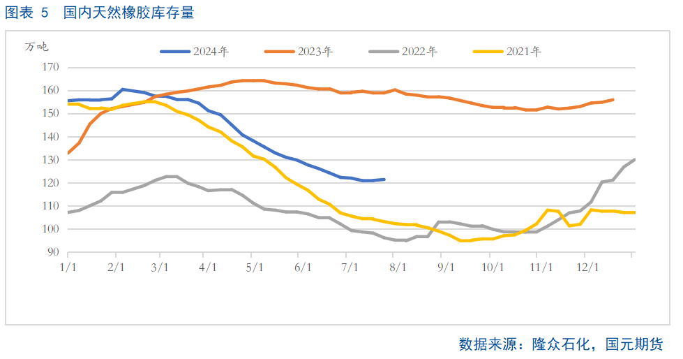 步入8月份,伴随国内外产区的全面开割,以及全球产量逐步回升,产量将呈现季节性上涨趋势,但考虑到到三季度拉尼娜的可能性较大,或对阶段性的市场供应产生扰动。而金九银十即将来临,叠加轮胎出口市场的向好局面延续,因此下游市场或有一定的改善,而天胶在利好因素推动下,库存将处于阶段性低点,不过将远低于2023年同期,而高于2022年同期。