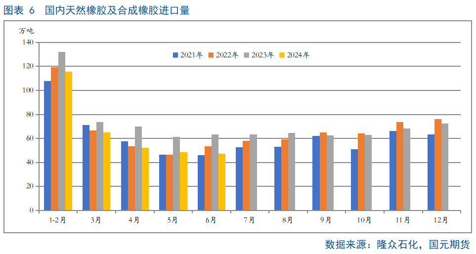 6月份之后下游轮胎出口市场延续向好的局面下,国内天胶社会库存及青岛现货库存下滑。但是由于7月份全球天然橡胶产量大幅回升,导致国内天然橡胶库存降幅收窄。截至7月28日,中国天然橡胶社会库存121.4万吨,深色胶社会总库存为72.58万吨,浅色胶社会总库存为48.8万吨,分别较6月末回落,但是幅度有限。从进口市场来看, 2024年6月中国天然及合成橡胶(包含胶乳)进口量47.1万吨,环比减少2.89%,同比减少25.59%,1-6月累计进口量328.4万吨,累计同比减少18%。
