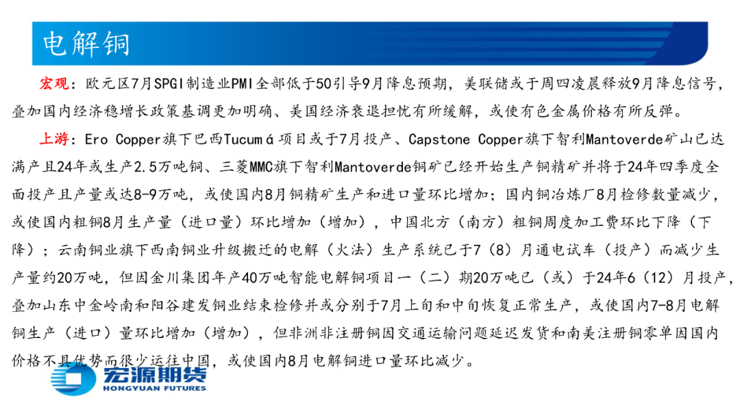 上游:Ero Copper旗下巴西Tucumá项目或于7月投产、Capstone Copper旗下智利Mantoverde矿山已达满产且24年或生产2.5万吨铜、三菱MMC旗下智利Mantoverde铜矿已经开始生产铜精矿并将于24年四季度全面投产且产量或达8-9万吨,或使国内8月铜精矿生产和进口量环比增加;国内铜冶炼厂8月检修数量减少,或使国内粗铜8月生产量(进口量)环比增加(增加),中国北方(南方)粗铜周度加工费环比下降(下降);云南铜业旗下西南铜业升级搬迁的电解(火法)生产系统已于7(8)月通电试车(投产)而减少生产量约20万吨,但因金川集团年产40万吨智能电解铜项目一(二)期20万吨已(或)于24年6(12)月投产,叠加山东中金岭南和阳谷建发铜业结束检修并或分别于7月上旬和中旬恢复正常生产,或使国内7-8月电解铜生产(进口)量环比增加(增加),但非洲非注册铜因交通运输问题延迟发货和南美注册铜零单因国内价格不具优势而很少运往中国,或使国内8月电解铜进口量环比减少。