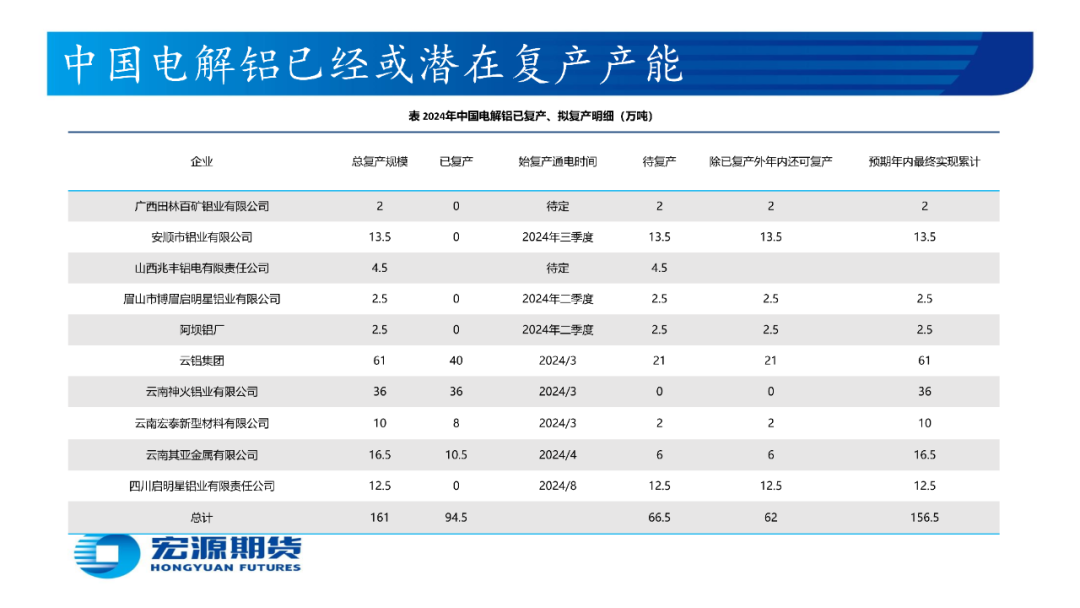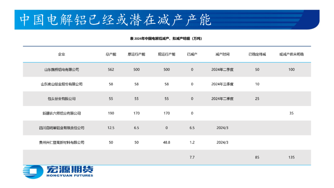 内蒙古华云三期42万吨电解铝产能仍将继续投产,四川启明星铝业12.5万吨电解铝产能预计8月技改结束逐步复产,叠加国内电解铝理论加权平均完全成本为18000元/吨左右而利润可观提振生产积极性,或使国内电解铝8月生产量环比增加,洛阳伊川豫港龙泉铝业20万吨电解铝产能转移至内蒙古赤峰东山铝业并或于25年6月投产。