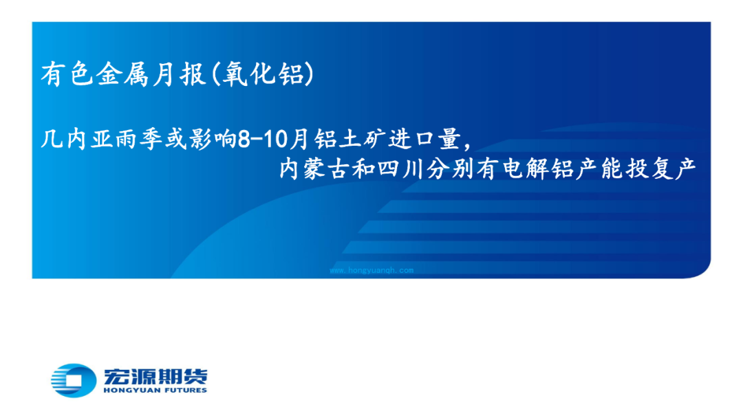 上游:山西个别矿和河南洞采矿已经复产,但因山西多数矿和河南露天矿仍保持停产、贵州部分铝土矿仍存生产阻力,或使国内铝土矿难改供给偏紧状态而价格趋涨,促中国企业积极寻求进口铝土矿,但几内亚7-8月雨季或影响国内铝土矿8-10月进口量,使澳洲和几内亚铝土矿现货供给偏紧而以执行长单为主致价格持稳或上涨,但是年底几内亚铝土矿进口量或环比增加、采暖季氧化铝厂环保检修或需求下降、印尼计划重新审视铝土矿出口禁令;