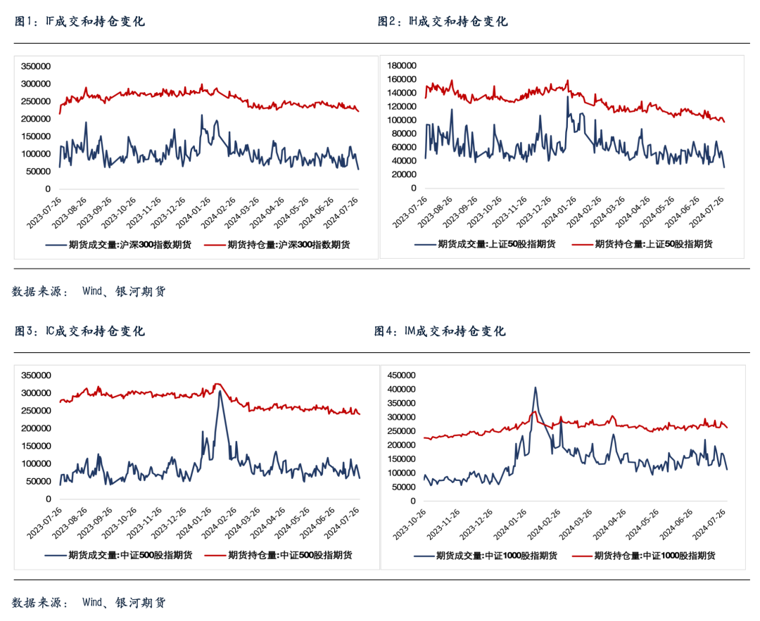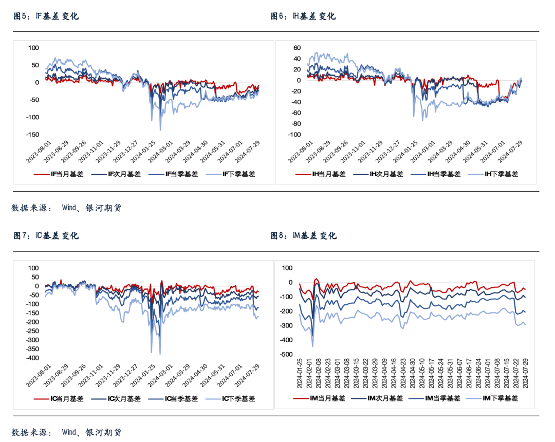 股指期货随现货大幅反弹,至收盘,主力成交合约IH2408涨1.94%,IF2408涨2.59%,IC2408涨4.71%,IM2408涨5.12%。行情火爆,期货表现强于现货,基差也大幅上行,除IM外,各品种当月合约全线转为升水,IH四个合约全部升水,其他品种远月合约贴水明显收敛。IC、IF、IH和IM成交分别增加64.6%、50.6%、18%和45.5%。IC、IF和IM持仓分别增加4.4%、1.9%和5.2%,IH持仓下降3.3%。