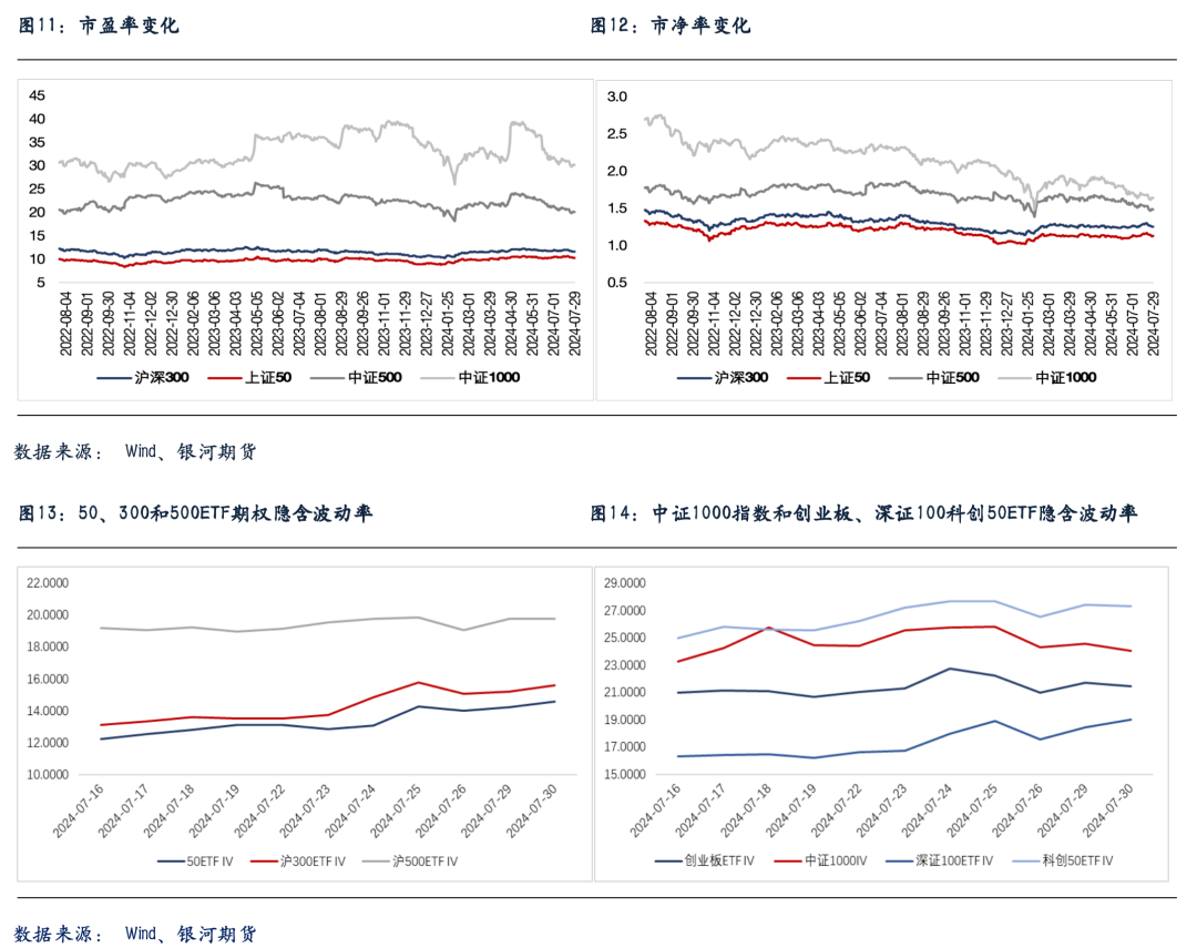 期权方面,期权标的多数放量上涨,期权成交量大幅反弹,其中中证500ETF期权成交量超200万张。隐波方面,多数期权隐波今天先跌后涨,上午隐波回落是由近期标的与隐波走势负相关驱动,午后随着标的价格进一步上行,多数期权品种隐波有所反弹。尽管A股情绪面有所回暖,但自6月以来隐波溢价逐渐收窄,标的实际波动有所抬升,预期未来隐波弹性将有所增加,且卖方策略delta对冲磨损也将上行。对于卖权策略来说,需要控制vega、gamma敞口,做好压力测试,减少日内对冲频率。