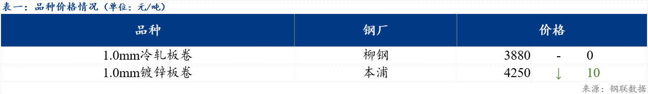今日市场冷轧板卷主流资源价格3880元/吨,较上一交易日持平;镀锌板卷主流资源价格4260元/吨,较上一交易日下跌10元/吨。