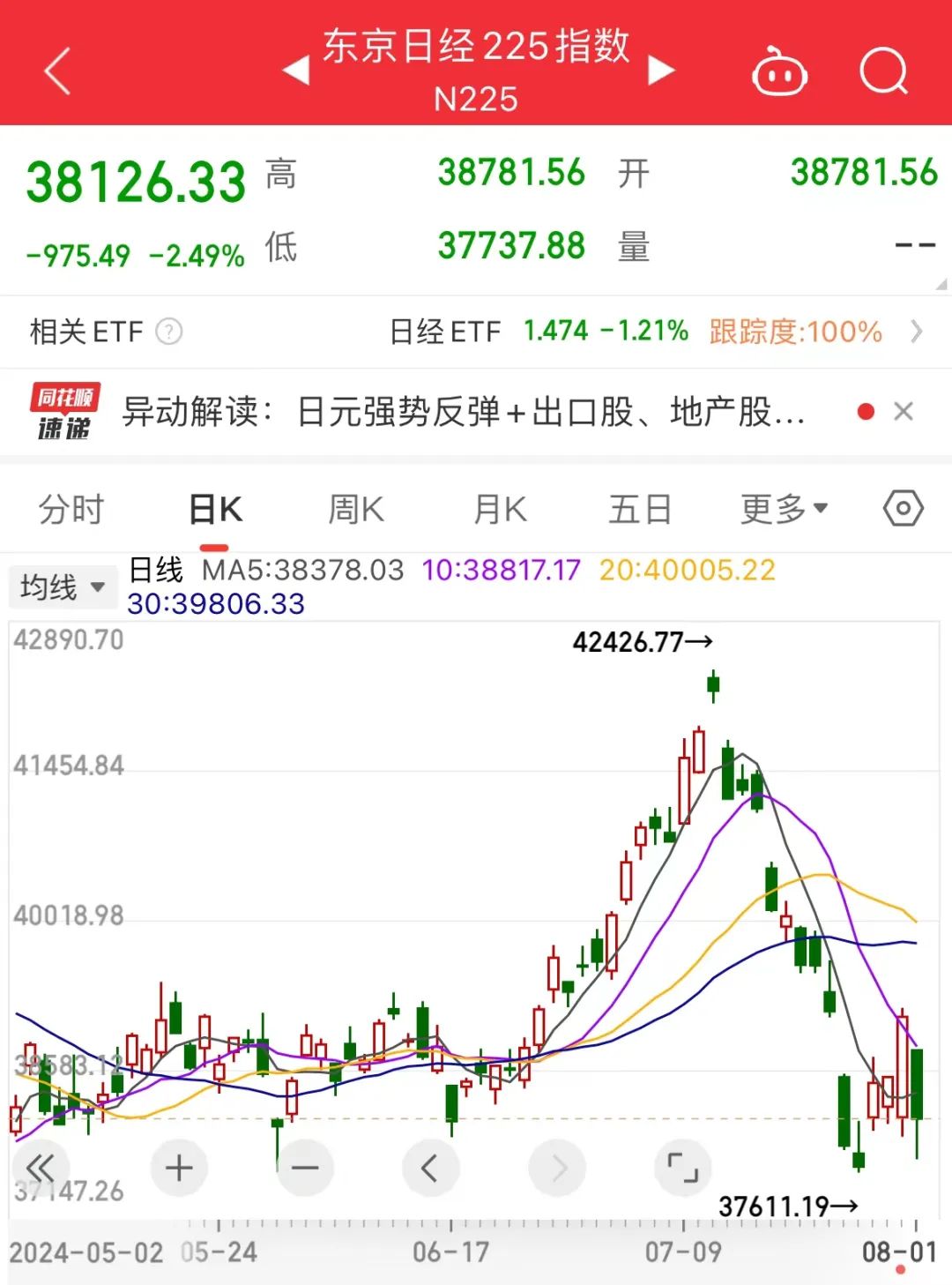 8月1日,日本股市开盘后大幅下挫,日经225指数盘中一度跌超1300点,跌破38000点,跌幅近3.5%。截至收盘,日经225指数跌975.49点,收报38126.33点,跌幅2.49%,抹去前一日涨幅。