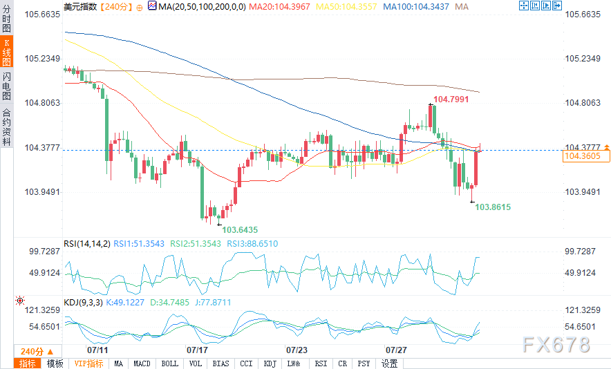 汇通财经APP讯——周四(8月1日)欧盘时段,美元指数在亚盘触及103.8615的低点后回升,盘中报104.4029/129,涨幅0.34%。