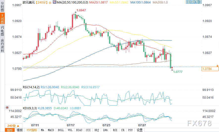 欧元/美元目前报1.0781美元,跌幅0.41%。4小时图表上,枢轴点位于1.08328,这对交易者来说是一个关键水平。直接阻力位在1.08706,进一步阻力位在1.08961和1.09216。