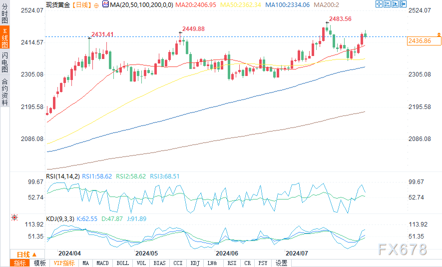 鲍威尔周三表示,可能会考虑9月份降息,这表明美联储的通胀之战已接近尾声。这最初推动金价升至两周高点,逼近7月17日创下的2483.60美元的近期纪录。